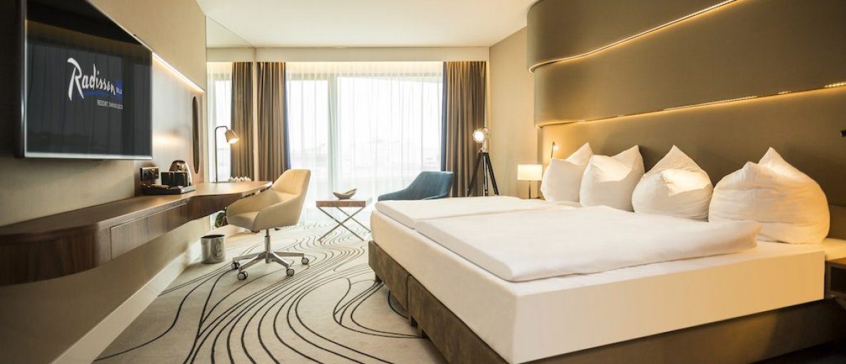 Projektanci wnętrz Radisson Blu Resort, Świnoujście inspirowali się ekosystemem morskim i jego płynnymi kształtami. Aranżacja pokoju w sposób awangardowy łączy klasykę ze świeżością żywiołu wody. Intrygujący wzór na wykładzinie odzwierciedla ukształtowanie dna morskiego. Płynna forma nad łóżkiem również nawiązuje do nieoczywistych struktur występujących pod powierzchnią wody.