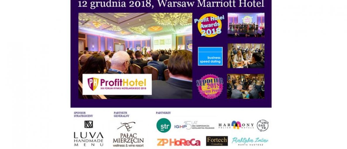 BROG B2B – media efektywnej komunikacji – wydawca m.in. Świat Hoteli oraz portalu Horecanet.pl serdecznie zaprasza wszystkich do całkowicie BEZPŁATNEGO UDZIAŁU w najważniejszym w Polsce spotkaniu przedstawicieli branży XIII Forum Rynku Hotelarskiego Profit Hotel 2018, któremu towarzyszyć będzie rozstrzygnięcie konkursu Profit Hotel Awards 2018. Wydarzenie odbędzie się 12 grudnia w Warsaw Marriott Hotel. Udział w konkursie PROFIT HOTEL AWARDS to wyjątkowa okazja promocji obiektów w Polsce, uhonorowania pracy i osiągnięć ich właścicieli, a także personelu. To również kształtowanie pozytywnego wizerunku całej branży w naszym kraju. Spośród zgłoszeń Jury złożone z prelegentów i panelistów XIII Forum Profit Hotel 2018 wybierze finalistów, a następnie zwycięzców poszczególnych kategorii.