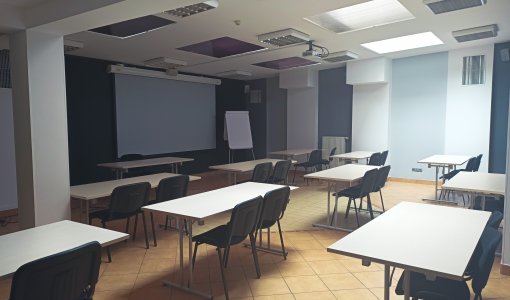Wyposażenie dodatkowe: bezprzewodowy Internet Wi-Fi, flipchart, projektor Full HD, super czuły ekran Full HD oraz system nagłośnienia 7.1., dwufazowa klimatyzacja