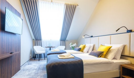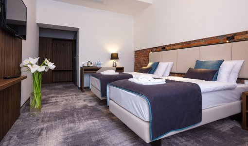Pokoje dwuosobowe typu PREMIUM z 1 lub 2 łóżkami –dwuosobowe pokoje z prywatną łazienką z jednym łóżkiem podwójnym (double) lub dwoma pojedynczymi (twin) o powierzchni około 19m2, zlokalizowane na głównych piętrach budynku (dojazd windą), z widokiem na spokojną ulicę. W standardowym wyposażeniu znajduje się TV, telefon, chłodziarka, zestaw do parzenia kawy i herbaty, suszarka do włosów.