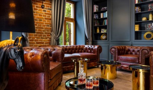 Dodatkowym miejscem stworzonym dla potrzeb kameralnych spotkań jest Sala Klubowa w stylu angielskim ze zdobioną biblioteką i meblami typu chesterfield.