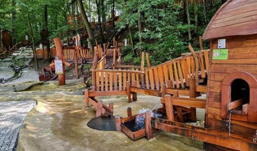 Magiczna Osada to plac zabaw rozbudowany o wiele atrakcji w tym strefę Pumptrack, Edukacyjną strefę Pingwina, w której woda jest niezbędnym elementem do zabawy, eksperymentowania i poznawania praw natury.  Strefa stanowi obszar, w którym poznacie wodę i jej właściwości. Wiedza na temat wody, którą można zdobyć przez aktywne poznawanie, to połączenie historii, geografii, biologii, fizyki i chemii. Od zasad używania wody po wiedzę, jak wielkim jest ona żywiołem. Na wielkim placu zabaw zostaną pokazane: przepływy, rzeki, zapory, koła wodne i elektrownie wodne. Poznacie ciekawe urządzenia i maszyny. Poza nauką w aktywnie spędzicie czas pokonując rozmaite przeszkody, uczące koordynacji i podnoszące sprawność fizyczną. Strefa łączy edukację ekologiczną z działaniami na rzecz środowiska naturalnego. Zapoznacie się z zasobami wody na Ziemi oraz z procesem jej obiegu. Wiemy, że stworzenie czegoś wyjątkowego zwykle zaczyna się od marzeń i wykorzystania energii młodych pasjonatów. Zebraliśmy te marzenia i wybudowaliśmy dla Was w Czarnym Groniu wyjątkowy plac zabaw. Wystarczy odrobina fantazji i chęci, by znaleźć się w miejscu zbudowanym z Waszych marzeń. Przekazujemy plac marzycielom i wszystkim tym, o nieograniczonej wyobraźni, którzy podzielają przekonanie, że place zabaw powinny służyć wszystkim dzieciom i powinny być realizacją ich wizji.