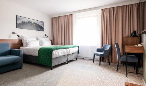 Każdy pokój wyposażony jest w wygodne łóżka z wysokiej klasy certyfikowanymi materacami firmy Hilding, telewizor, biurko, zestaw do parzenia herbaty i kawy. Na uwagę zasługuje również wielopunktowe oświetlenie, dzięki niemu każdy może stworzyć odpowiadający mu klimat – od romantycznego, po taki najbardziej odpowiedni do pracy. W pokojach znajdują się również gustowne łazienki, z kosmetykami kąpielowymi, suszarką i ręcznikami.