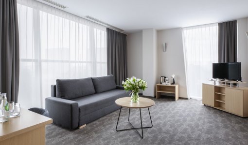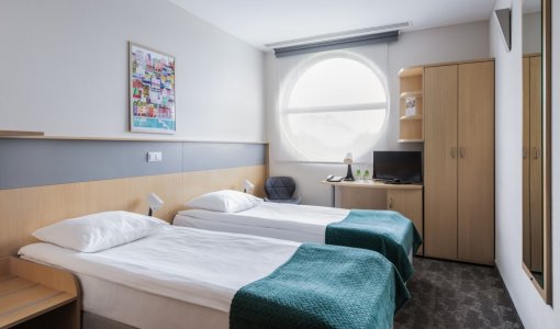 - 100 pokoi dwuosobowych oraz 7 apartamentów z ergonomicznym miejscem do pracy