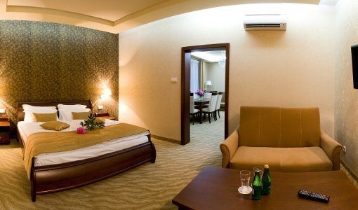 Hotel Korona Spa & Wellness**** to wyjątkowe miejsce stworzone z myślą o Gościach, którzy cenią sobie komfort, wysoką jakość usług oraz rodzinną atmosferę. Elegancki wystrój wnętrz, nowoczesne zaplecze konferencyjne, profesjonalna obsługa, wykwintna kuchnia, wygodne pokoje to idealny wybór dla naszych Gości. Oferujemy Państwu 150 miejsc noclegowych w 2 apartamentach oraz 48 komfortowo wyposażonych pokojach z przestronną łazienką, telewizją satelitarną, radiem, telefonem i bezprzewodowym bezpłatnym łączem internetowym. Dysponujemy windą, udogodnieniami oraz specjalnie przystosowanym pokojem dla osób niepełnosprawnych. Hotelowa restauracja oferuje obfite i smaczne śniadania bufetowe. Zatrzymującym się u nas osobom udostępniamy bezpłatny monitorowany parking na 170 aut. Dla najmłodszych poza salą zabaw oferujemy plac zabaw w ogrodzie. W Hotelu Korona Spa & Wellness**** pobyt umila strefa wodna SPA obejmująca basen z hydromasażami, łaźnię, saunę, jacuzzi, pokój relaksu oraz salę fitness a także 6 profesjonalnie wyposażonych gabinetów SPA.